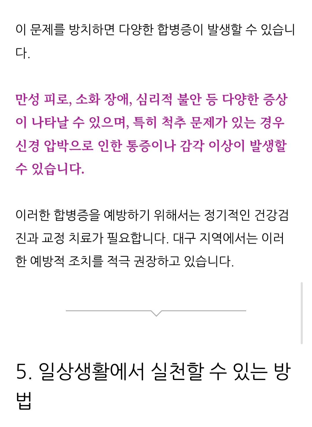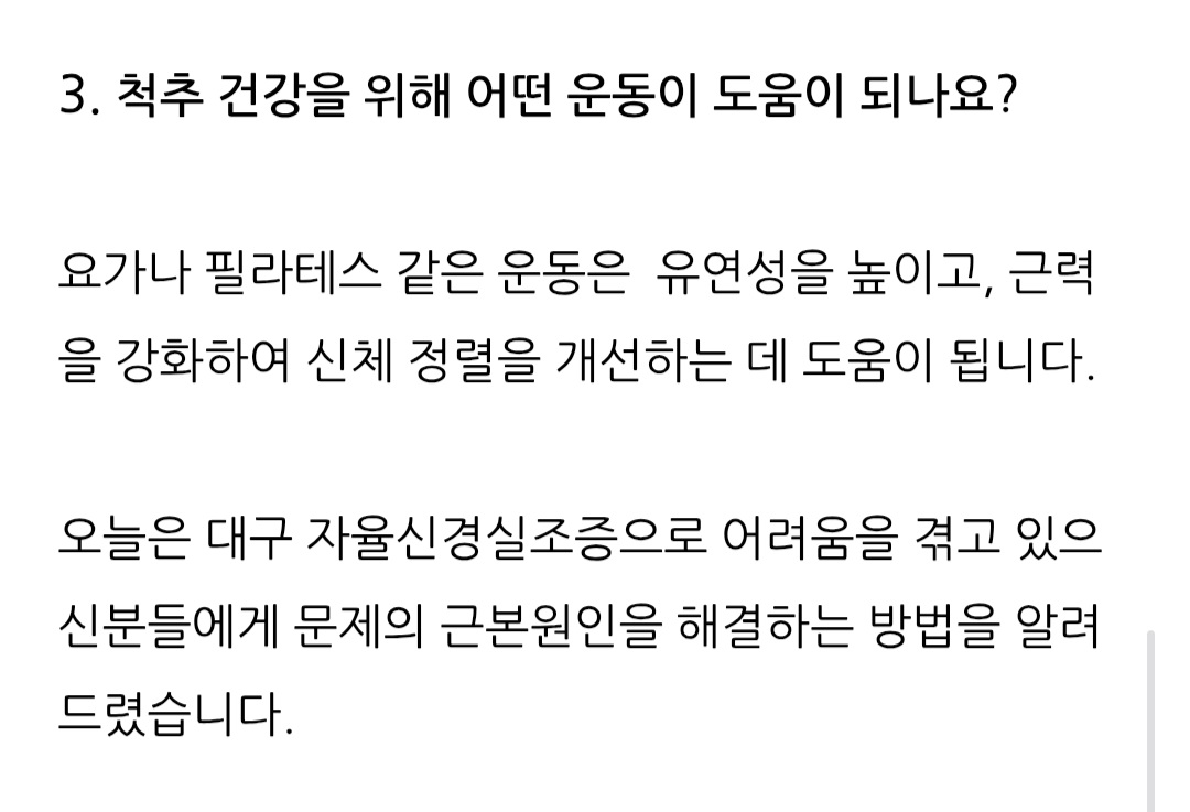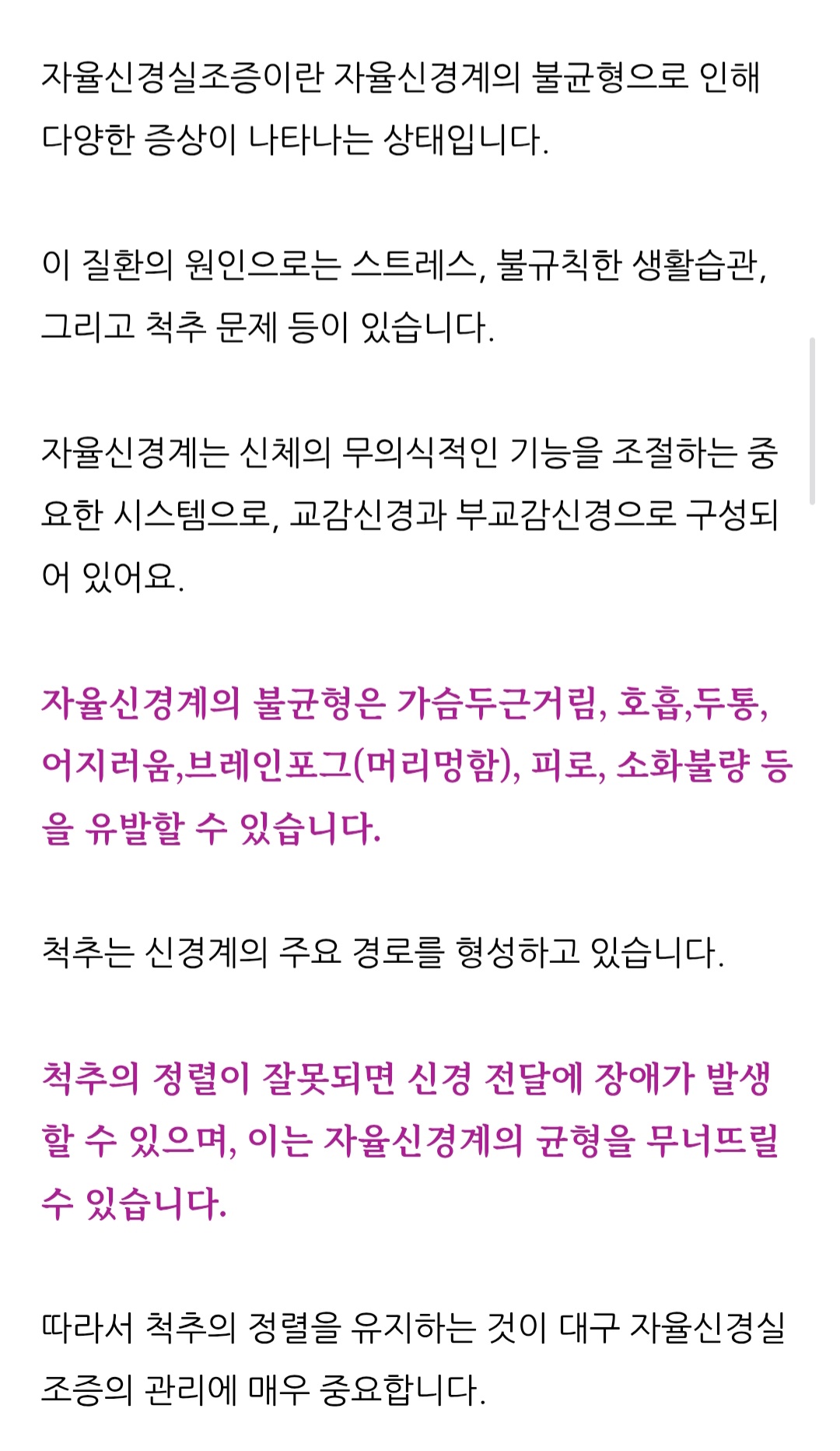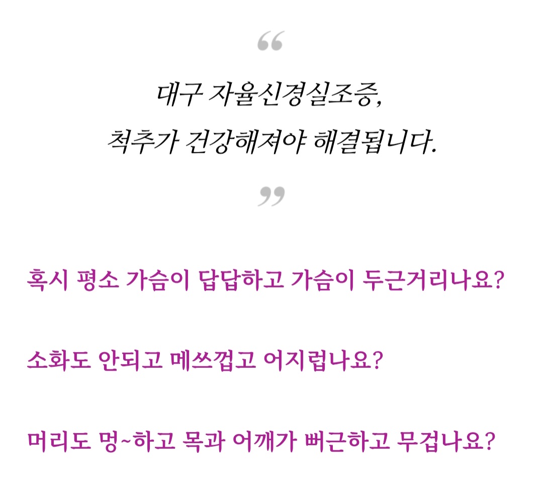 대구자율신경실조증을 앓고 있는 경우, 자칫 자주 오인되기 쉬운 증상들을 저희는 정확히 구분하고, 맞춤형 비수술 치료계획을 제안합니다. 이는 MRI나 CT로 확인되지 않는 신경계 이상이라도 신경계의 작용 원리를 기반으로 한 신경주사나 운동치료의 섬세한 접근으로 개선하고 있습니다.