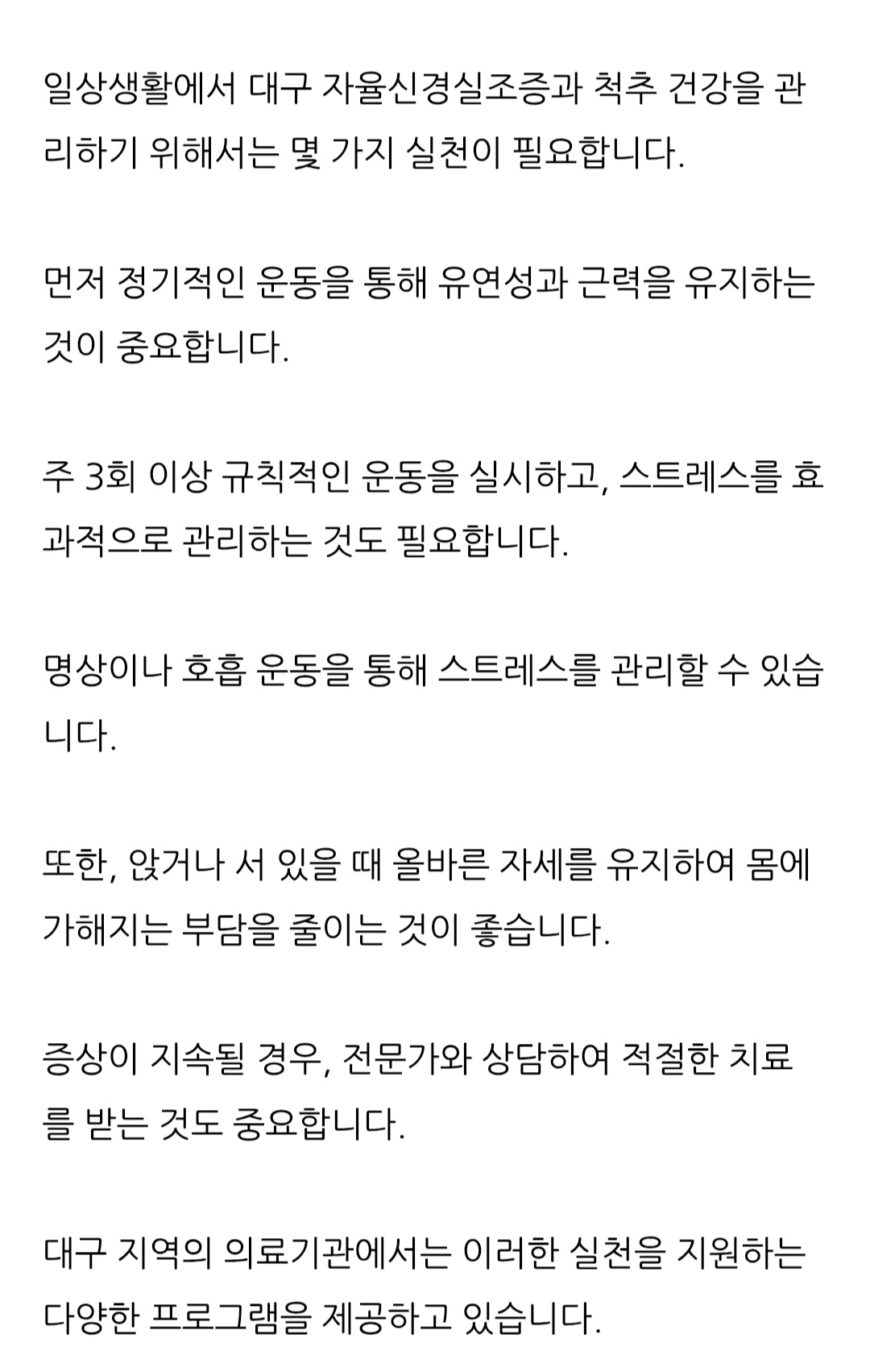 A: 대구자율신경실조증은 신경계 혼란으로 인해 나타나는 다양한 신체 증상들을 일컫습니다. 자주 피로하거나 근육이 뻣뻣해지는 등 다양한 형태로 나타날 수 있습니다.